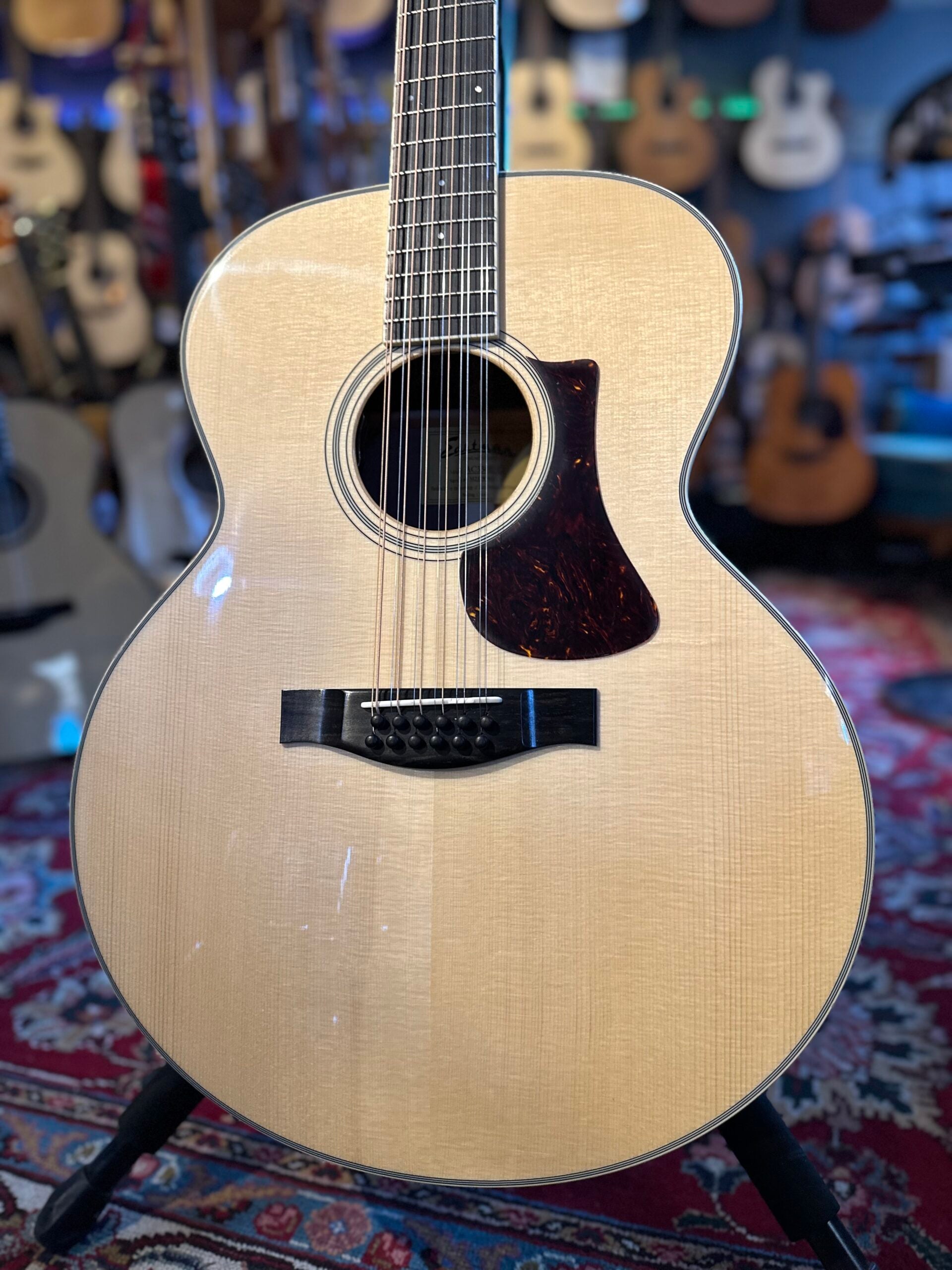Big acoustic electric Jumbo 12 string, great playability for a 12 string. Solid feel, lots of volume. Beautiful woodgrain on backside. Killer acoustic