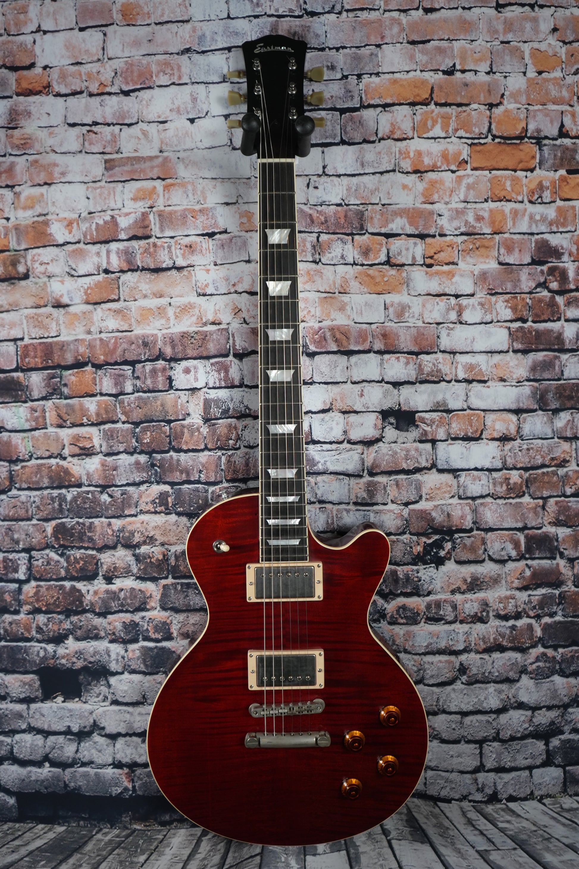 The Eastman SB59/TV is a solid-body electric with a classic single-cut shape and quality build that feels substantial without being heavy. It pairs a carved maple top with a one-piece okoumé body and neck, giving the guitar a strong foundation for rich tone and sustain.