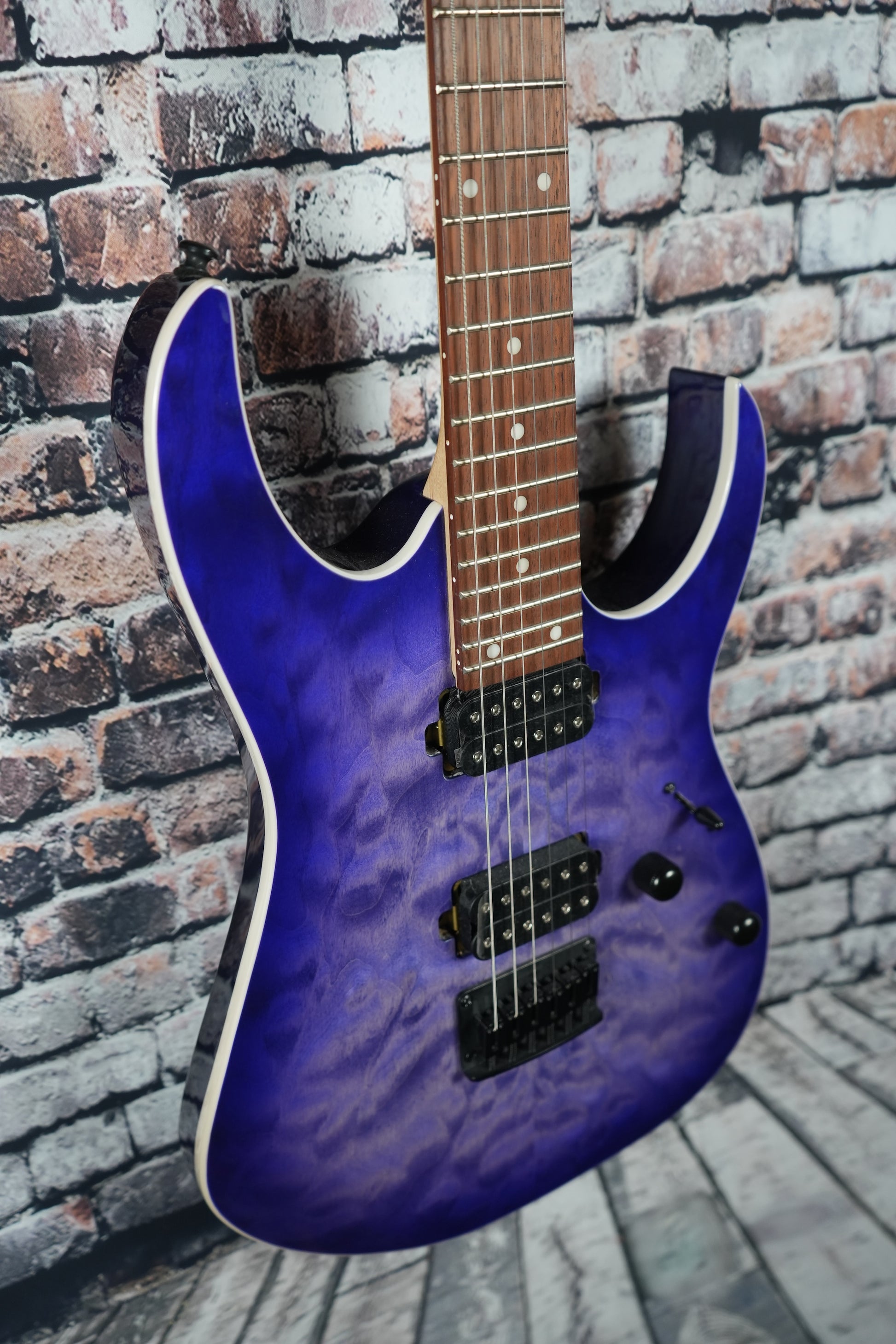 For sound, the RG421QM uses a pair of ceramic humbuckers with a five‑way selector switch, giving you everything from clean, chime‑like tones in the single‑coil positions to thicker, punchier sounds when both humbuckers are engaged. Simple volume and tone controls make it easy to shape your sound without fuss.