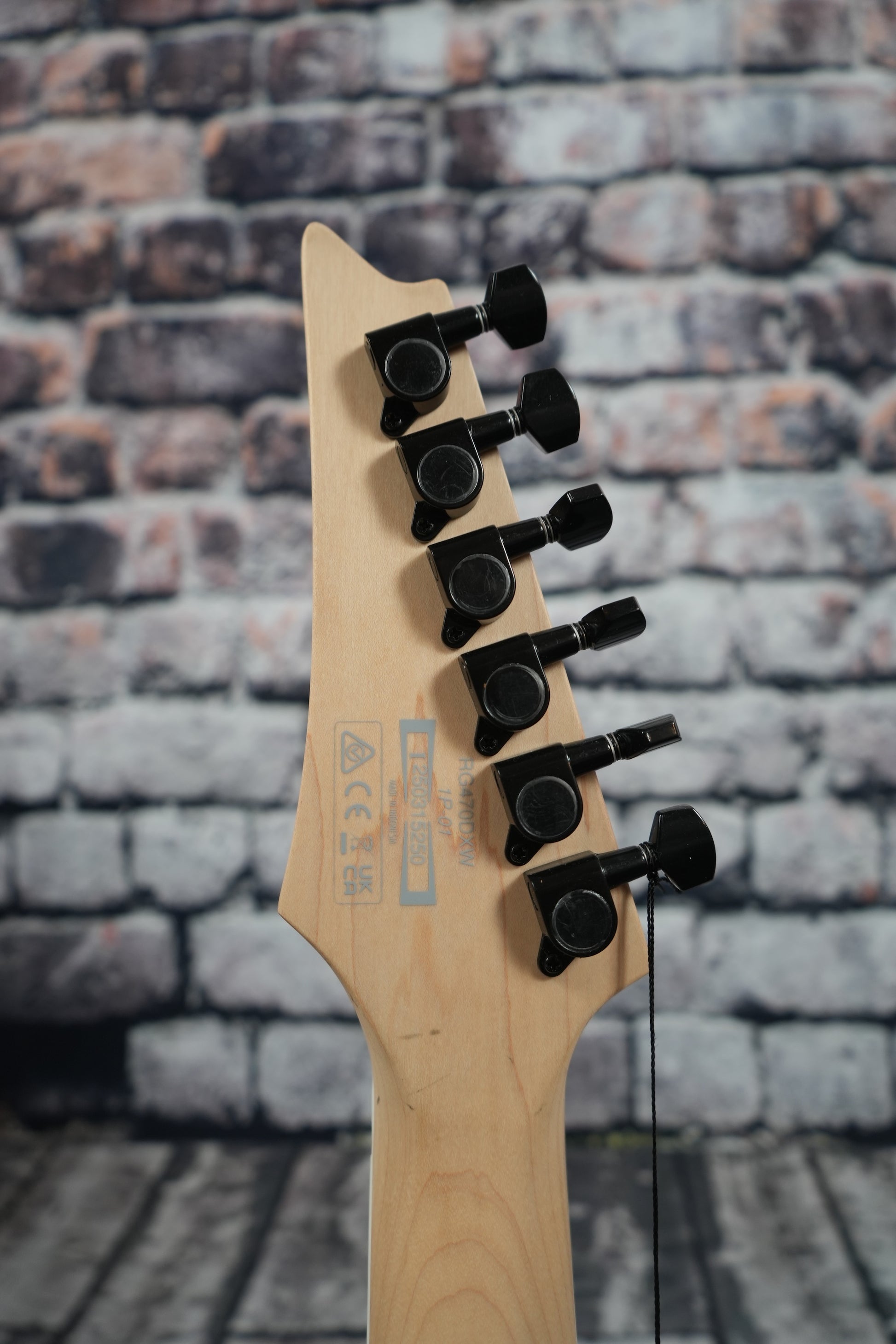 The guitar features a bolt-on Wizard III maple neck with a jatoba fingerboard and 24 jumbo frets. That combination feels fast under the hand and gives you plenty of room to move up and down the neck for solos and riffs. Sharktooth markers add a familiar touch that many players enjoy.