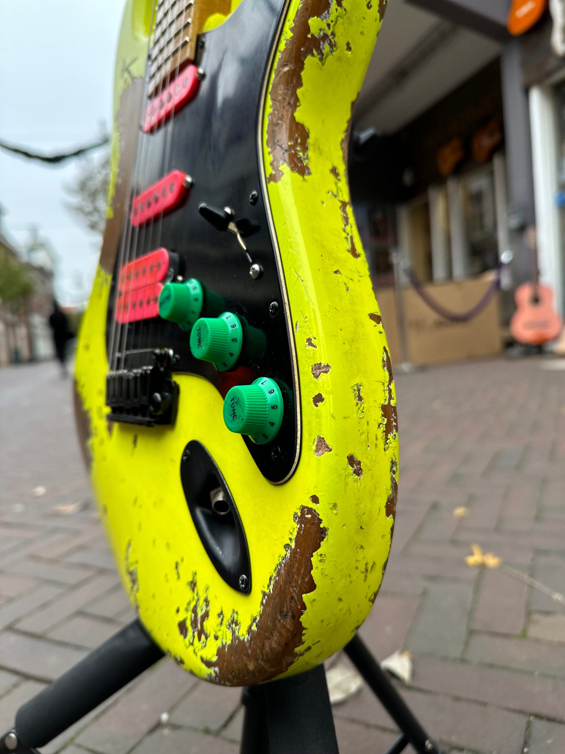 Masterbuild in Germany by Nick Page for Maybach Guitars. This 80's (dessert)Yellow, is of course inspired bij Steve Vai's Ibanez Jem7. You can't get more 80's!! This is a one off build Maybach Stradivari strat, with a alder body, Nick page special custom Amber pickup set HSS, Gotoh hardware, its pots and Paper in oil capacitor. Nitro ultra heavy aged 80's yellow finish! Great stage guitar, looking cool!! Comes with the beautiful Maybach hardcase.