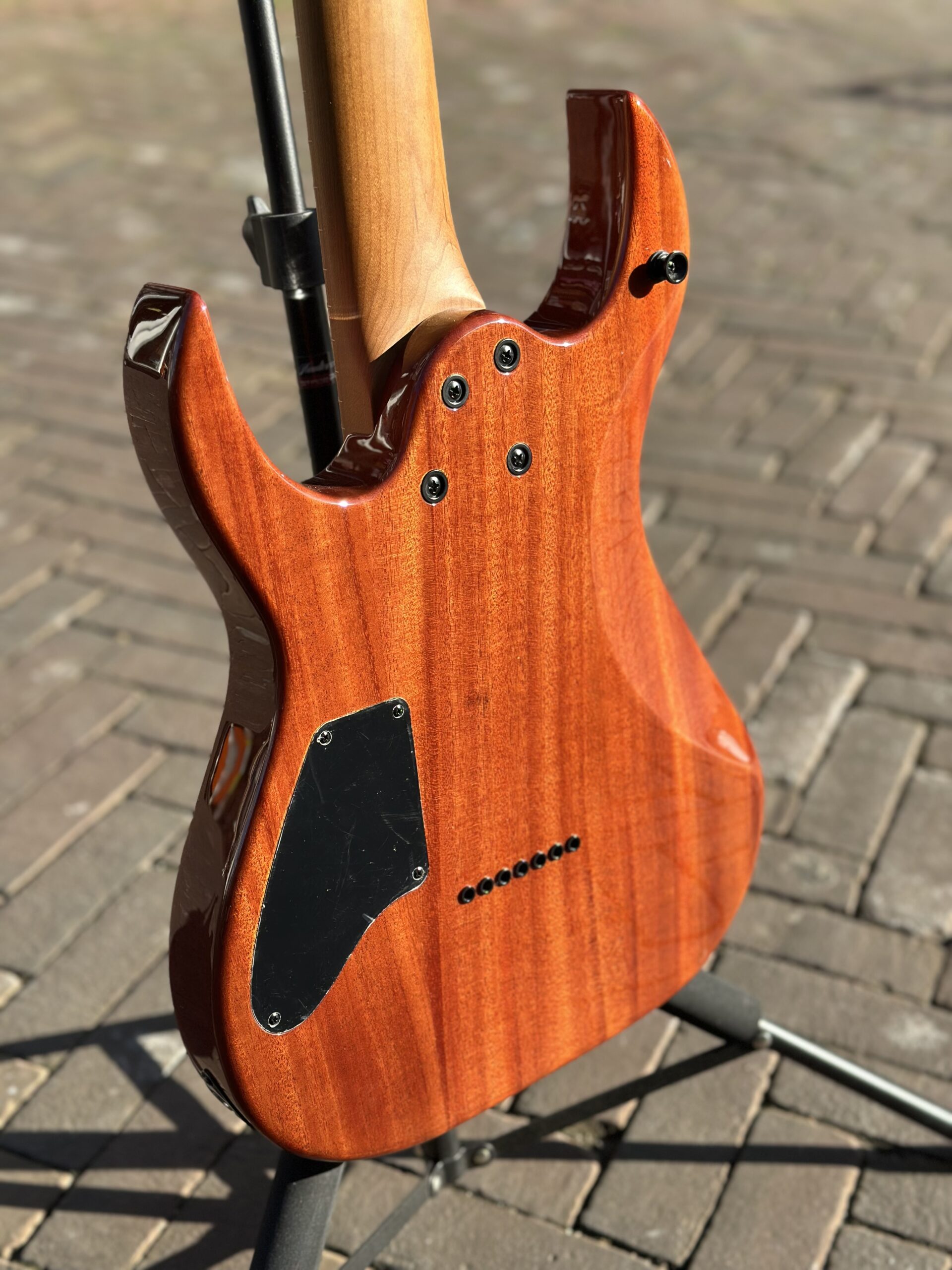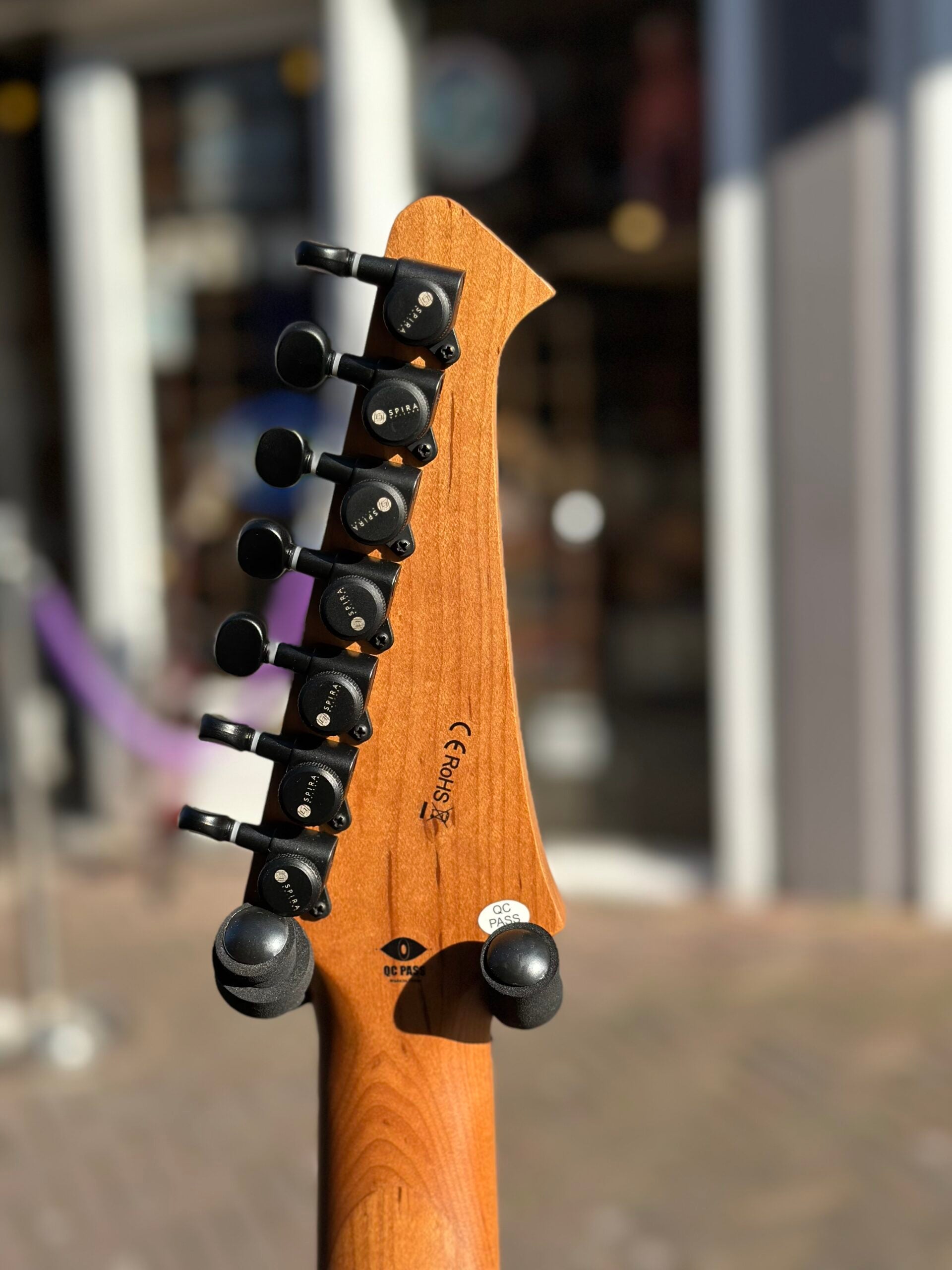 The S-507 is Spira’s flagship 7 string model, lovingly crafted for players who expect the highest level of performance and aesthetics. The S-507 features a luxurious mahogany body with a stunning quilted maple top, delivering both exceptional resonance and eye-catching beauty. The roasted maple neck and fretboard offer unmatched stability and a smooth, responsive playing experience, ideal for advanced techniques.